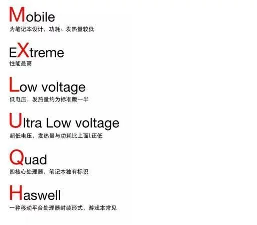四位数中最重要的是第一位,它表示了 CPU的代数,因此这一位的数值越大,该 CPU的架构也就越新,从而带来更高的性能和更低的功耗。后三位数字对 CPU的性能通常影响不大,我们没有必要考虑。最后跟着的字母就很有玄机,我们经常看见很多超薄本大吹自己用了i7的处理器,可到头来性能却不敌一个装了 i3的台式机,原因就在这个字母上。