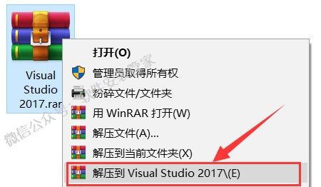 2.鼠标右击软件压缩包,选择解压到【Visual Studio 2017】。