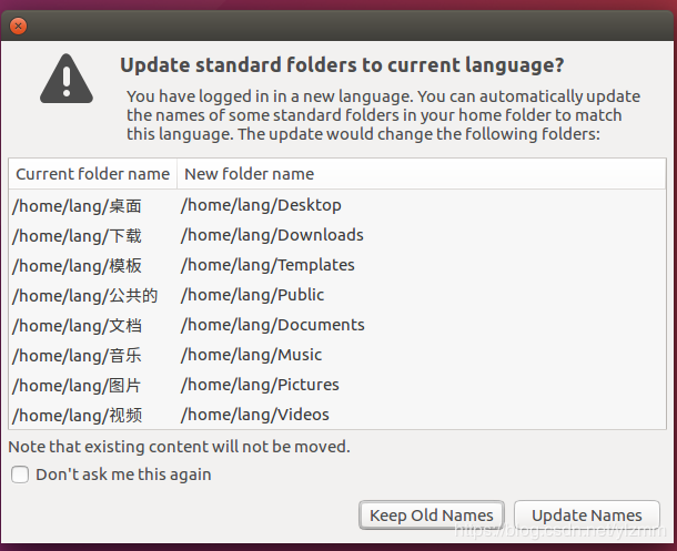 重启。开机后会看到这个弹出框。由于我们更改了语言,现在是否更新文件夹的名称。选择Update Names。