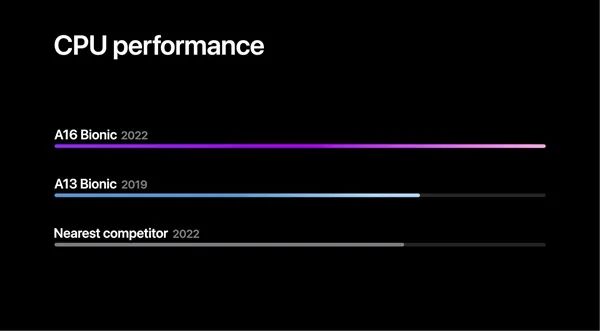 A16重点提升能效、显示和拍照性能,制造工艺从台积电5nm升级为台积电4nm,晶体管数量从150亿个增加到160亿个,再创新纪录。