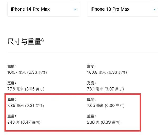 其中iPhone 14 Pro Max重量达到了240g,比iPhone 13 Pro Max重2g,厚度为7.85mm,比iPhone 13 Pro Max厚0.2mm。版。